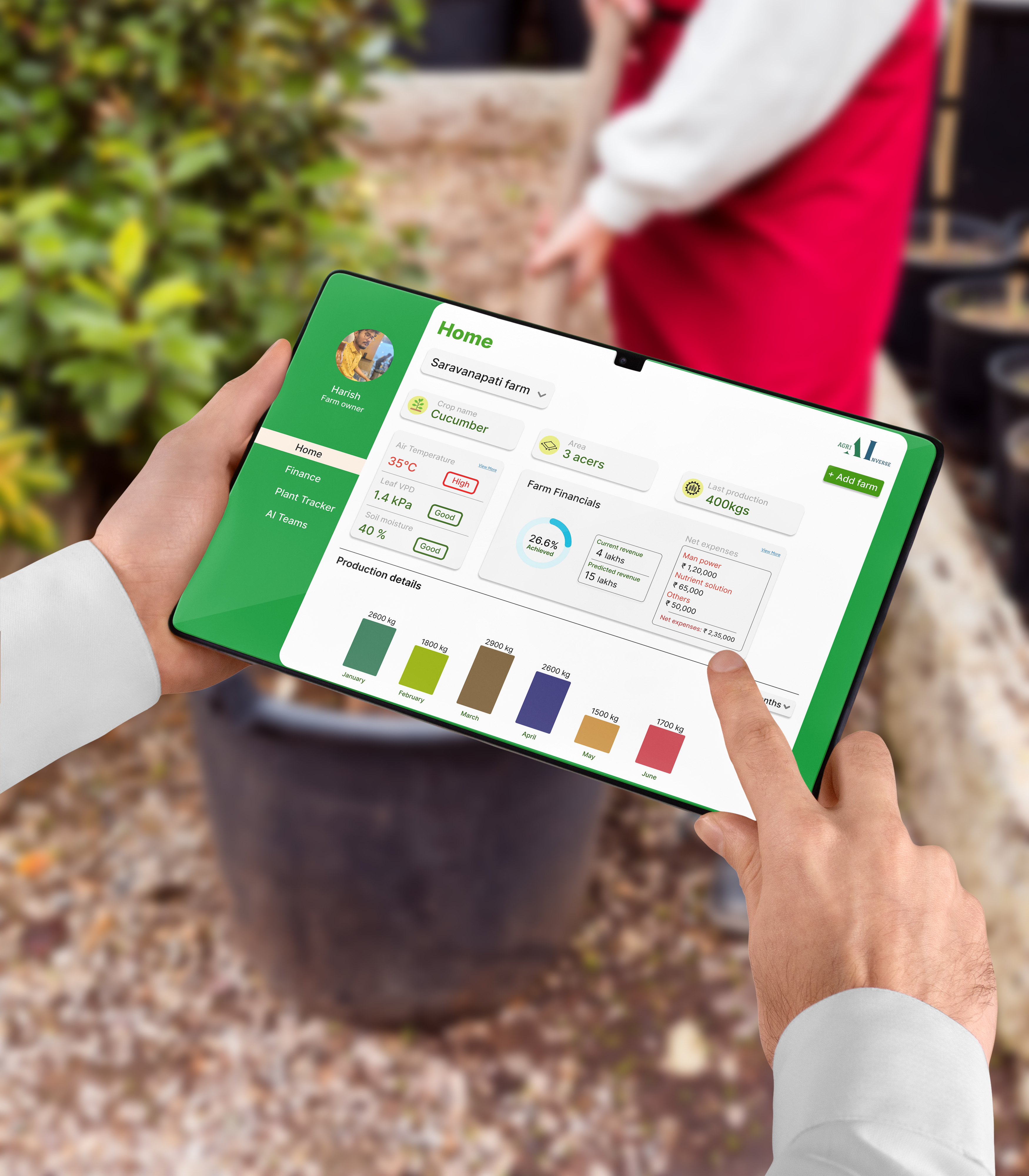 Agri Inverse's all-in-one dashboard has revolutionized our farm management. With real-time IoT data, detailed crop production insights, and comprehensive financial tracking, we've seen a significant boost in efficiency and productivity. Ability to analyze the last 6 months of production has been invaluable for strategic planning. Highly recommended for anyone serious about smart farming!